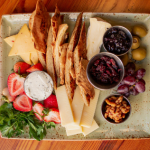 Roth three-chili gouda, aged cheddar, herb goat cheese spread, and double cream brie, with olives, candied walnuts, jam, assorted fruits, flatbread crackers, and fresh bread